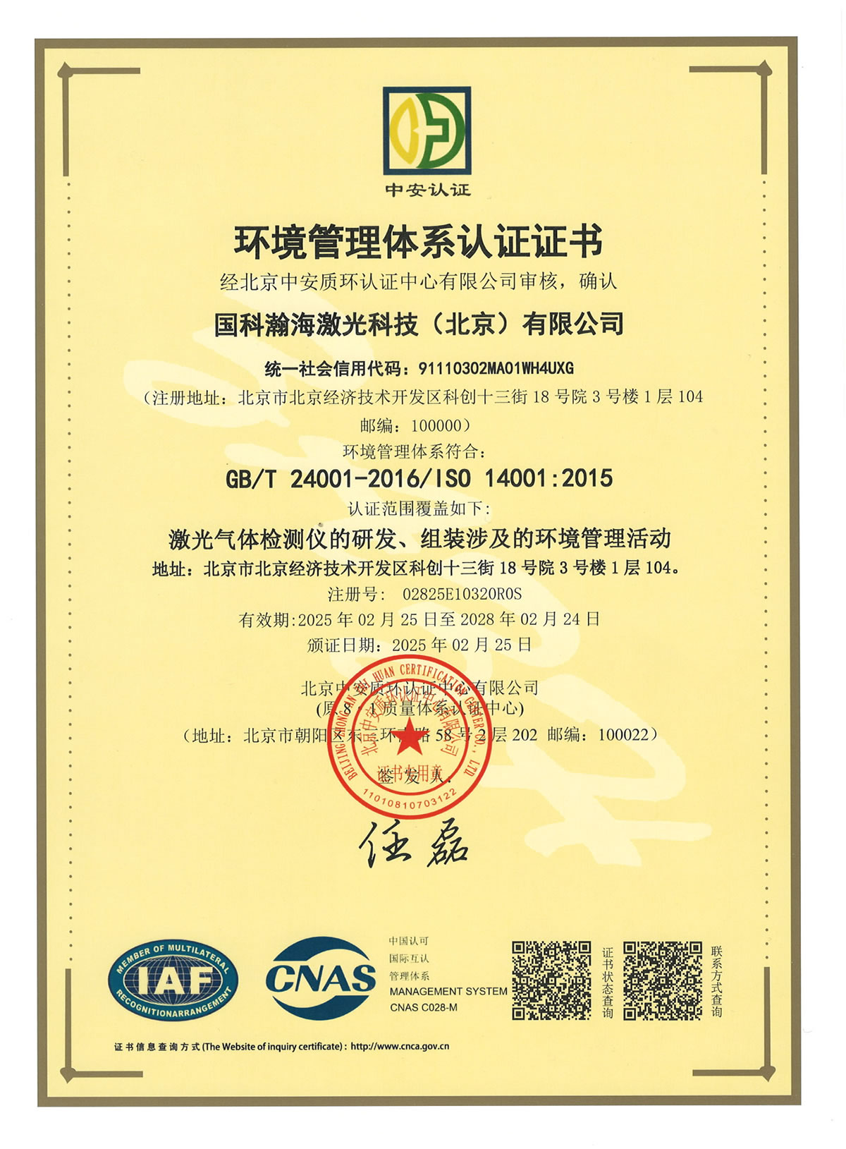环境管理体系认证证书