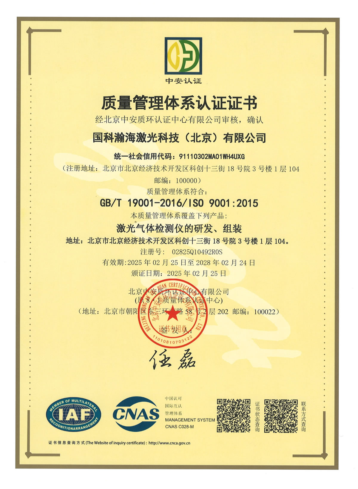 质量管理体系认证证书