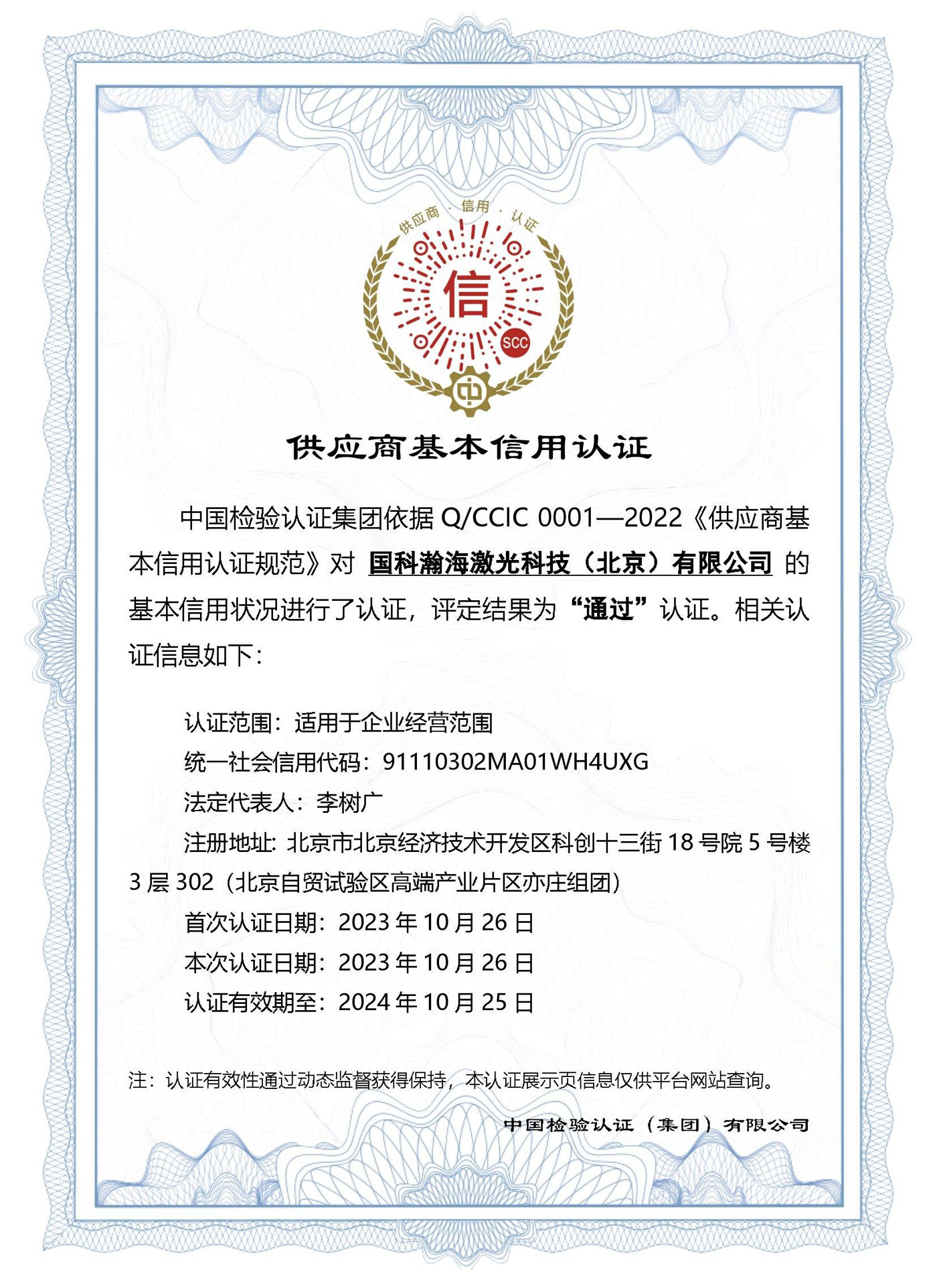 供应商基本信用认证证书