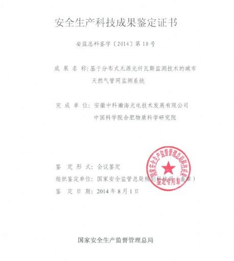 2014年8月1日,国家安全生产监督管理总局规划科技司在合肥组织召开了由安徽中科瀚海光电技术发展有限公司完成的“基于分布式无源光纤瓦斯监测技术的城市天然气管网监测系统”科技成果鉴定会。