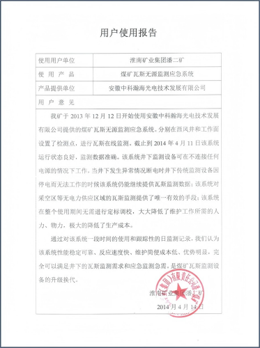 淮南矿业潘二矿使用我公司煤矿瓦斯无源监测应急系统,分别在西风井和工作面设置检测点进行瓦斯在线监测。该系统井下监测设备可在不连接任何电源的情况下工作。当井下发生异常情况断电时井下传统监测设备因停电而无法工作的时候该系统仍能继续提供瓦斯监测数据;该系统对采空区等电力供应区域的瓦斯监测提供了唯一有效的手段;该系统在整个使用期间无需进行定标调校,大大降低了维护工作所需的人力、物力,极大地降低了生产成本。