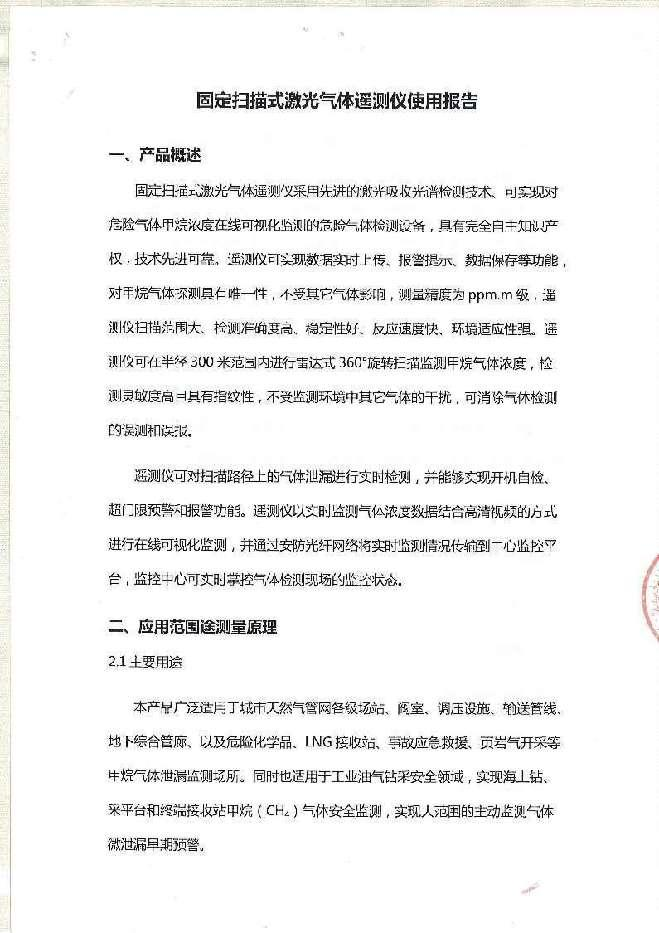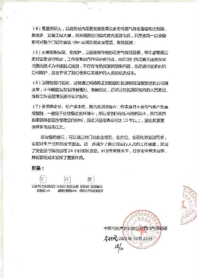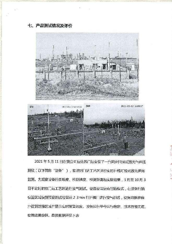 2021年5月在中石化西北油田分公司拉依苏门站使用1套固定扫描式激光气体遥测仪。实现对门站工艺区进行实时在线可视化激光泄漏监测。